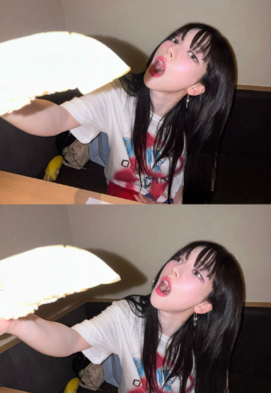 카리나는 붉은 스프레이가 뿌려진 듯한 디자인의 박시한 흰색 반팔티를 입고 있습니다.