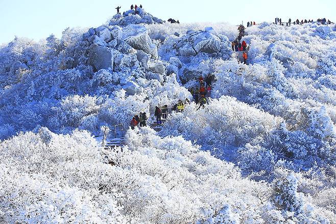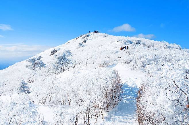 덕유산 국립공원의 최고봉인 향적봉(1,614m)은 눈 덮인 겨울 풍경과 사방으로 펼쳐진 절경 덕분에 등산객들이 꼭 한 번 오르고 싶어하는 명소입니다.