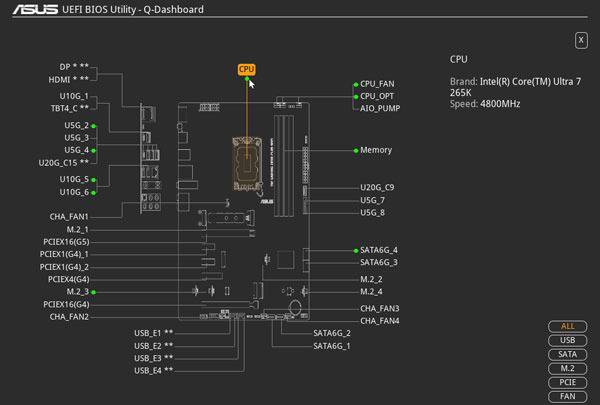 Q-Dashboard는 메인보드에 어떤 장치가 어디에 연결되었는지 직관적으로 표시해주고, 연결된 장치를 클릭하면 해당 장치와 관련된 바이오스 설정으로 바로 이동할 수 있다. 같은 장치라도 바이오스에 여러 항목이 있는 만큼 전체 항목이 정리되어 제공되는 것은 아니지만, 바이오스 조작에 생소하다면 이것만으로도 접근성 개선 효과가 있다.