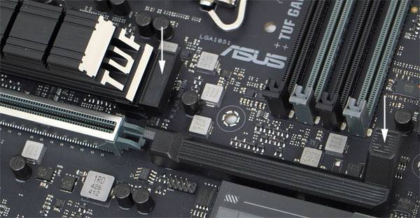 이중 PCIe 5.0 x4Lane M.2 소켓에 사전 제공되는 대형 방열판, PCIe 5.0 x16 슬롯에 장착된 확장 카드는 손쉽게 분리할 수 있도록 Q-Release 설계가 적용되어 간단히 누르는 것만으로 고정을 풀고 방열판과 확장 카드를 분리할 수 있다.