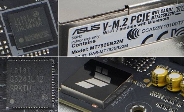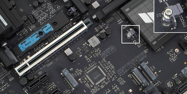 백패널 I/O 포트에는 최신 와이파이 7 규격을 지원하는 ASUS WIFI 카드의 안테나가 연결 포트가 노출되어 있다. 안테나 연결 포트는 일반적인 나사 고정 방식의 SMA 타입이 아니라, 고정/ 이탈 편리성을 위해 푸시핀 방식으로 설계된 독자적인 디자인이 적용되었다.