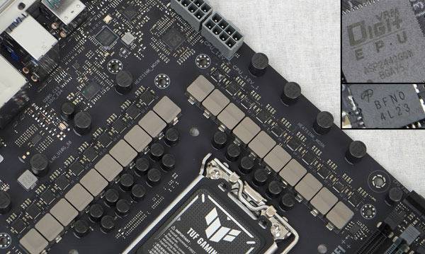 이에 ASUS TUF GAMING Z890-PLUS WIFI 코잇 메인보드는 총 20페이즈(16+1+2+1) 전원부를 구성하였으며, 여기에는 80A 전류 공급 능력을 갖춘 알파&오메가社의 BFNO 4L23 DrMOS와 ASUS의 Digi+VRM 컨트롤러가, 5K TUF 블랙 메탈릭 캐퍼시터, 8단 PCB, 충분한 전력 공급을 위해 듀얼 8핀 보조전원 커넥터가 사용되었다.