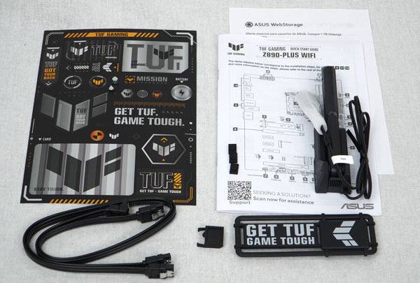 ASUS TUF GAMING Z890-PLUS WIFI 코잇 메인보드 본체외의 부속물로는 와이파이 및 블루투스 모듈용 안테나, TUF 브랜드 인테리어용 스티커, 방열판 결합 방식의 인테리어 플레이트, PCIe 5.0 M.2 소켓용 Q-Slide 클립, 단면 SSD용 스탠드 높이 조절 고무재질 댐퍼, SATA 케이블, 간단 메뉴얼과 ASUS 웹스토리지 보너스 설명서 등이 제공된다.