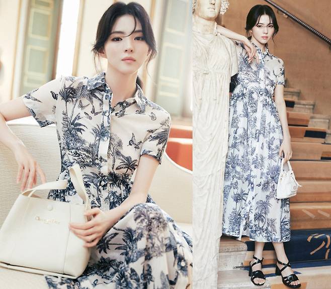 한소희의 스타일링을 완성해 준 드레스와 백, 슈즈 모두 디올(DIOR) 제품으로, 특히 세련된 플레어 실루엣과 프린트가 돋보이는 Dioriviera 미디 셔츠 드레스가 시선을 사로잡았습니다.
