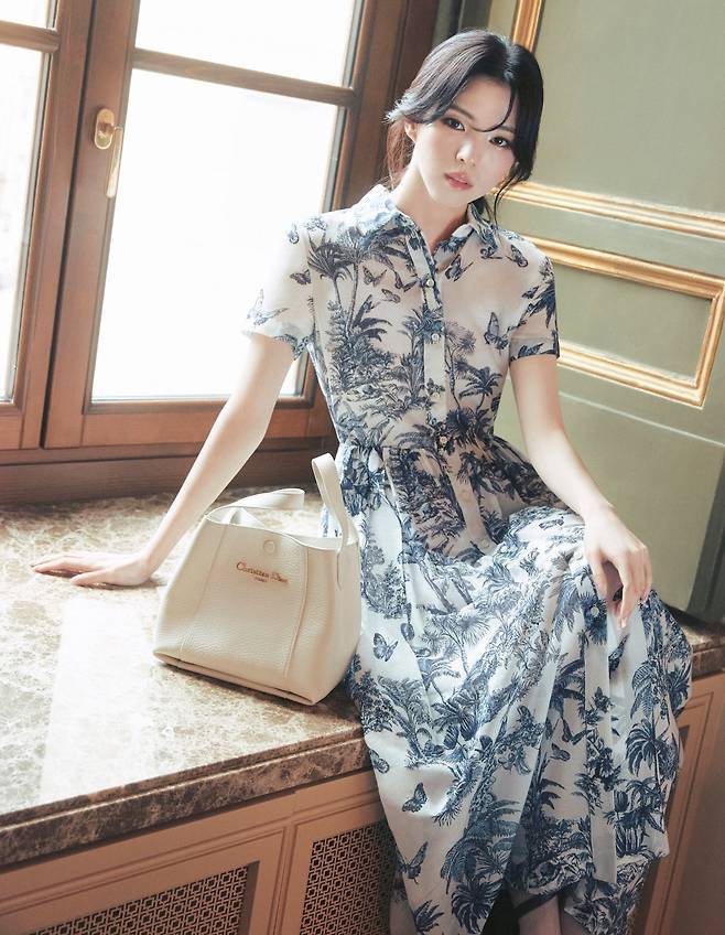 한소희는 디올의 프린트 셔츠 원피스를 착용하고 고풍스러운 공간 속에서 압도적인 분위기를 완성했습니다.