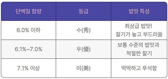 단백질 함량에 따른 등급은 수(秀)·우(優)·미(美) 세 가지로 나뉜다. 마치 예전 초등학교 성적표와 비슷해 이해하기 쉽다. 단백질 함량이 6% 이하이면 ‘수(秀)’, 6.1~7%는 ‘우(優)’, 7.1% 이상은 ‘미(美)’로 평가된다. 당연히 찰기와 부드러움은 ‘수(秀)’가 가장 뛰어나고, ‘미(美)’가 가장 떨어진다.