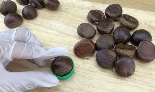 뚜껑(플라스틱 병뚜껑, 우유캡, 음료수뚜껑 등) 위에 밤을 올려두고 칼이나 집게로 1~2cm 깊이로 X자 칼집을 내줍니다.