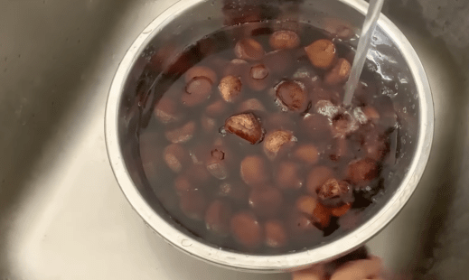 찜이 끝난 즉시 찬물에 1~2분 넣어 식혀주면 껍질이 자동으로 분리됩니다.