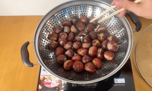 찜기에 밤을 넣고 강불로 5분, 끓기 시작하면 중불로 20분 찐 뒤 불을 끄고 10분 정도 뜸을 들입니다.