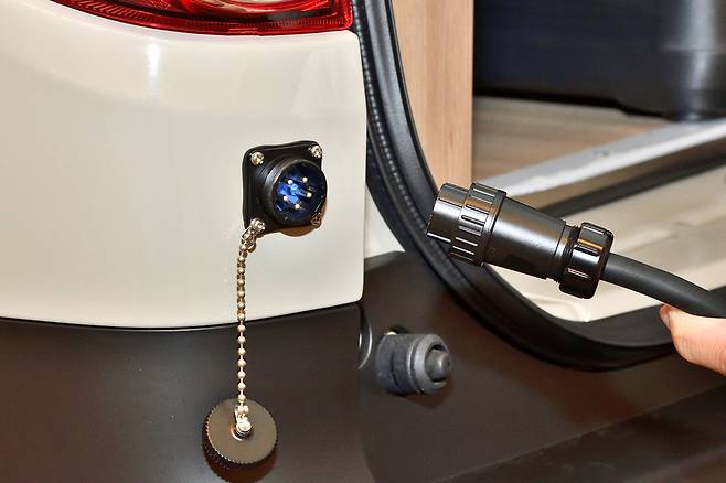 후면부에는 외부 전력 포트가 장착되어 있어 캠핑 중 다양한 전자 장비를 사용하는 데 유용하다.