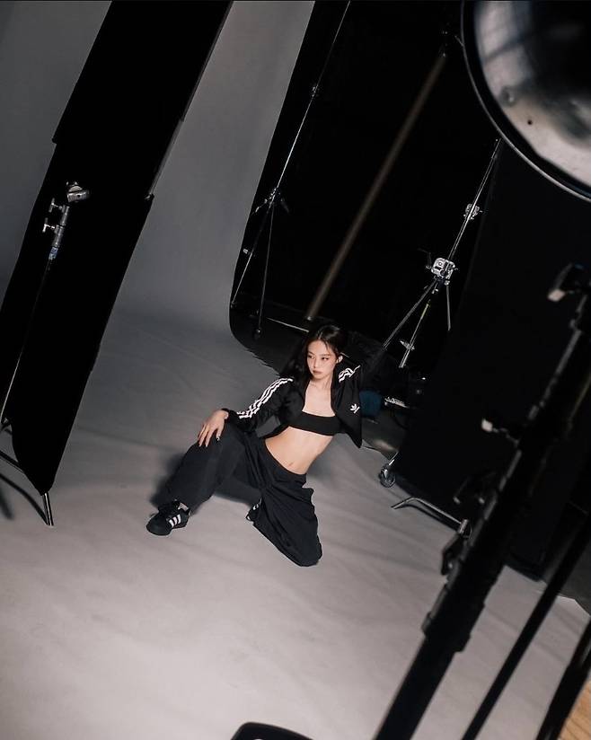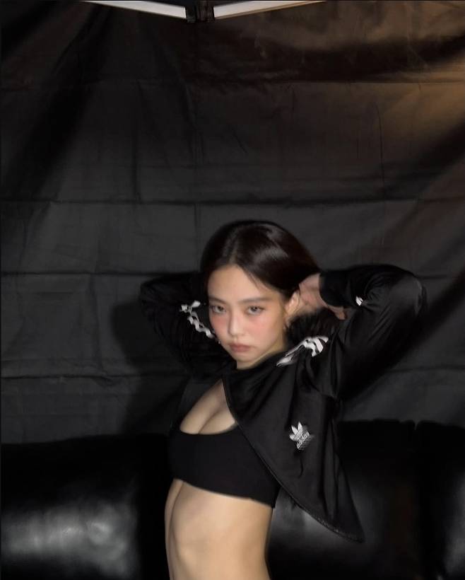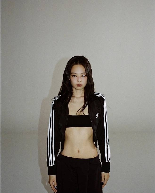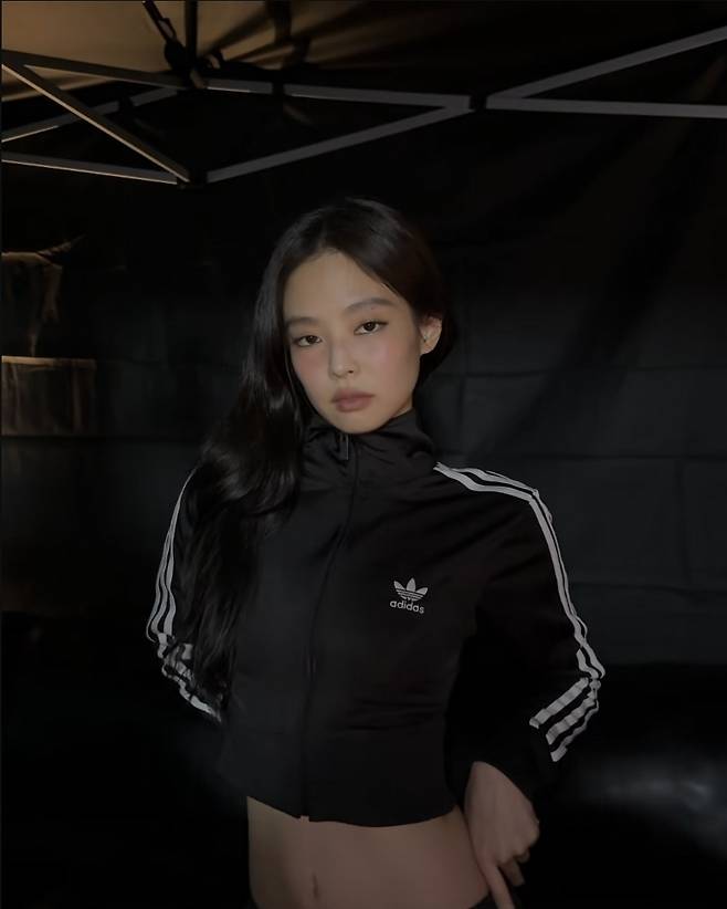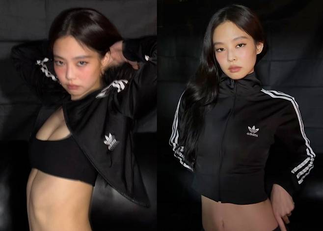 제니는 아디다스의 블랙 트랙탑과 크롭탑 조합으로 역대급 스포티 섹시미를 뽐냈습니다.