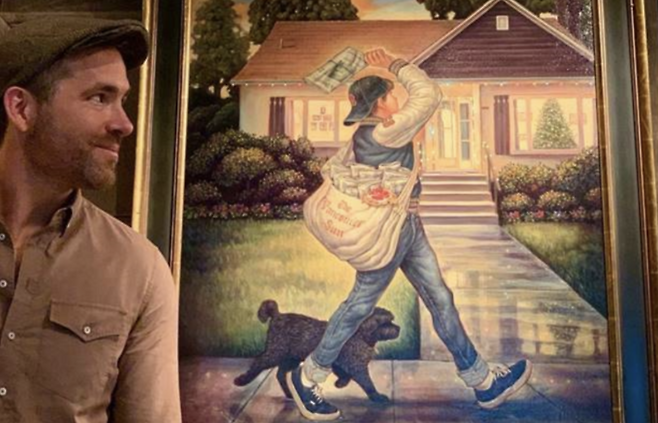 선물의 정체는 바로 그림 한 점이었습니다. LA의 아티스트 대니 겔리오트가 그린 이 그림은 한 소년이 신문 배달을 하는 평범한 그림처럼 보입니다. 하지만 그림을 뜯어보면 라이언 레이놀즈의 성장기가 그대로 담겨 있다 해도 과언이 아닙니다.