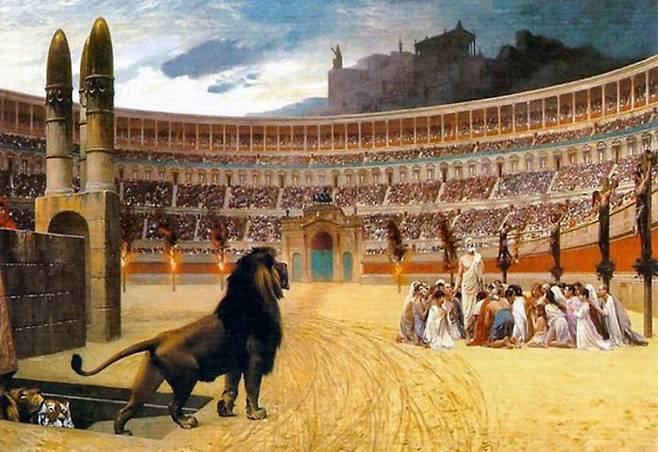 라틴어로 ‘damnatio’란 ‘처벌’ ‘단죄’를 의미한다. ‘bestias’ 야수 또는 맹수다. 즉 ‘damnatio ad bestias’는 야수를 이용한 단죄라는 뜻이 된다. 이 처형법은 고대 로마인들이 기원전 2세기부터 즐긴 일종의 여흥으로 기록돼 있다. 당시 로마인들에게 맹수 사냥이나 맹수와 싸움은 대단히 흥미로운 즐길거리였다. 이를 위해 원형극장을 만들기도 했다. 역사서나 벽화, 그림 일부에 그 흔적이 남아있다.