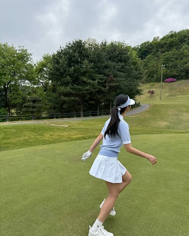 첫 번째 룩은 골프장 위에서 포착된 활동적인 스포츠 스타일이다. 하늘색 니트 소재의 짧은 슬리브 톱에 화이트 플리츠 스커트를 매치해 스포티하면서도 러블리한 무드를 연출했다. 포니테일 헤어와 바이저, 골프 장갑까지 깔끔한 디테일이 더해져, 골린이들의 여름 골프룩 참고서로 손색없다.