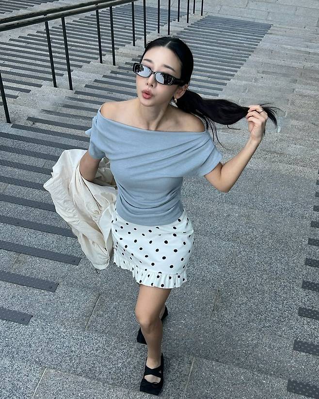 두 번째 룩은 계단 위에서 당당한 포즈를 취한 일상 패션이다. 오프숄더 디자인의 그레이시 블루 톱은 목선을 드러내며 여성스러움을 강조했고, 프릴과 도트 패턴이 포인트인 미니 스커트는 러블리함을 더했다. 여기에 큼직한 선글라스를 매치해 Y2K 무드까지 자연스럽게 녹여냈다.