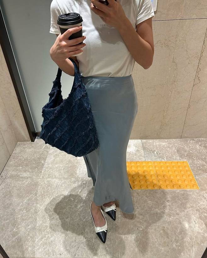 세 번째 스타일은 미드나잇 블루 데님백과 함께한 오피스룩 느낌의 블루 코디다. 화이트 티셔츠에 실키한 질감의 아이스 블루 롱 스커트를 매치하고, 블랙&화이트 배색의 슬링백 슈즈로 마무리해 미니멀하면서도 우아한 분위기를 자아냈다. 카페 테이크아웃 컵을 들고 찍힌 모습에서 데일리한 자연스러움도 느껴진다.
