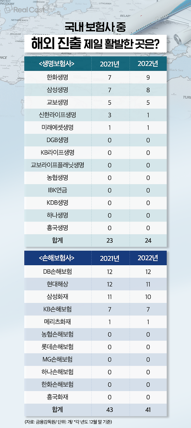 생명보험사는 2021년에 비해 2022년에 현지법인·해외지점·해외사무소가 1개 더 늘어났는데요. 반면 손해보험사는 2개 감소한 모습입니다. 그렇다면 해외에서 활발하게 활동 중인 보험사는 어디일까요?