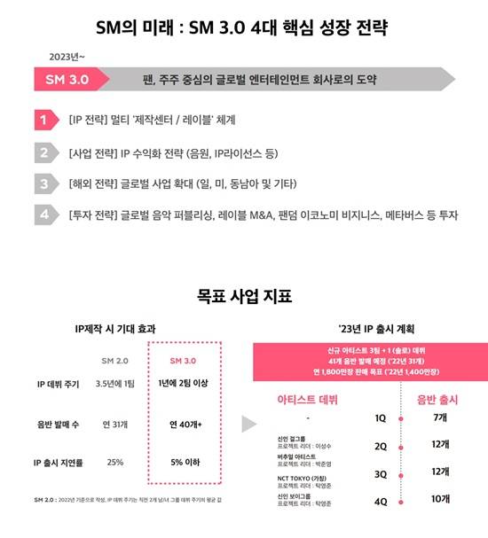 SM 3.0은 SM이 영위하는 엔터테인먼트업의 본질인 양질의 IP를 제작하는 것, 해당 IP를 통해 사업적으로 수익화 하는 것, 그리고 국내를 넘어서 글로벌에서의 IP 확장하는 것, 마지막으로 IP를 통해 수익화 된 재무성과를 토대로 글로벌 음악 퍼블리싱 사업, 레이블의 인수, 팬덤 이코노미 비즈니스, 그리고 메타버스와 같은 신규 사업에 투자하는 것으로, SM의 미래 성장 동력이 될 4대 전략인 IP, 사업, 해외, 투자 전략을 기반으로 추진된다.