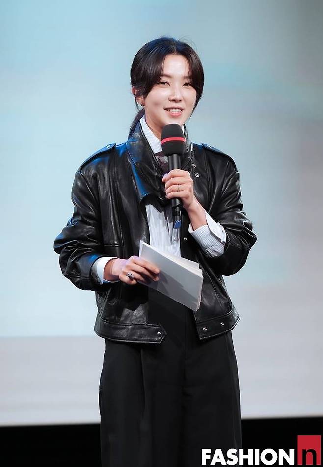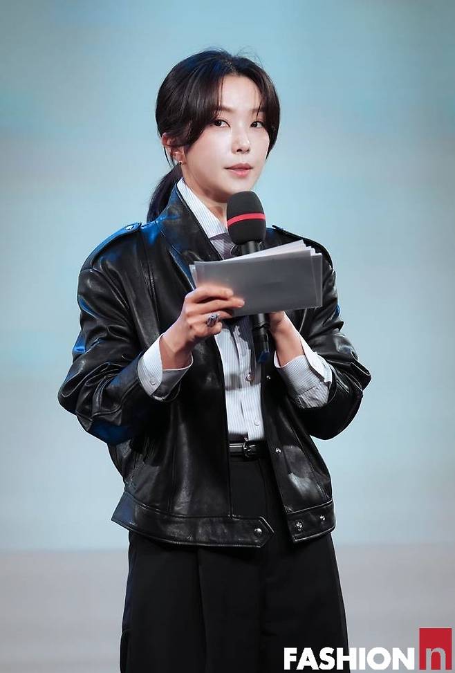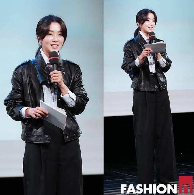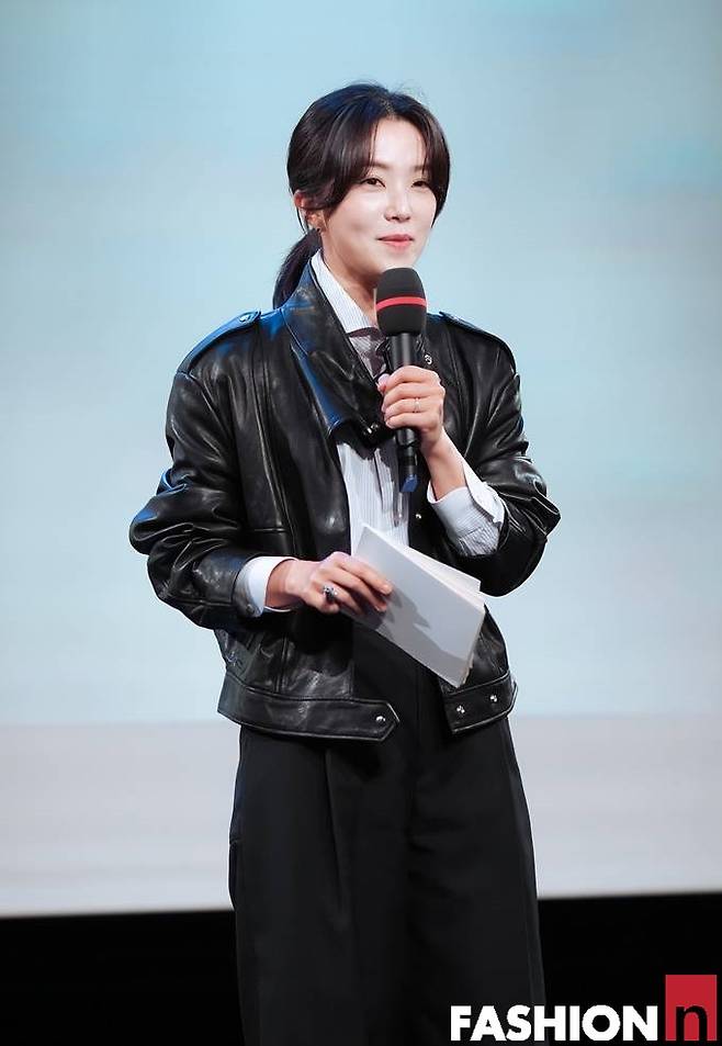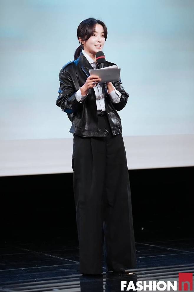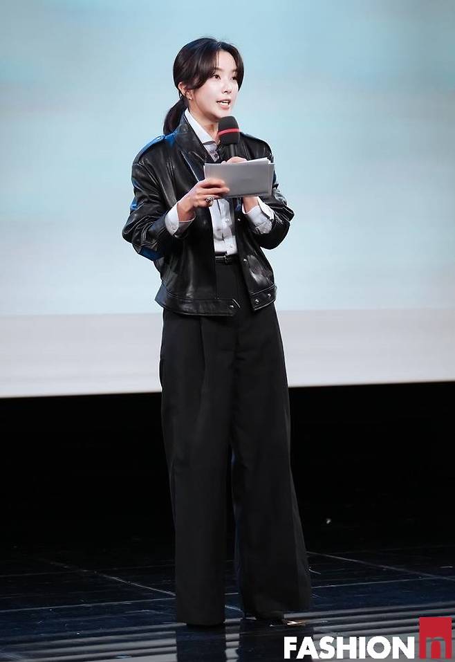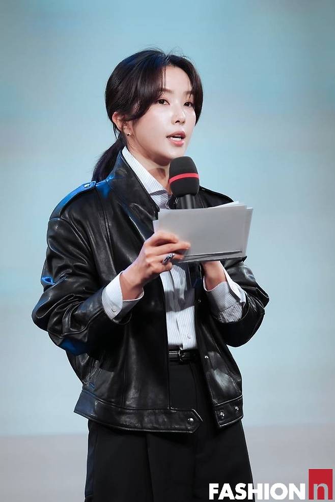 강지영 아나운서가 레더 재킷으로 파워우먼 MC룩을 연출했다.