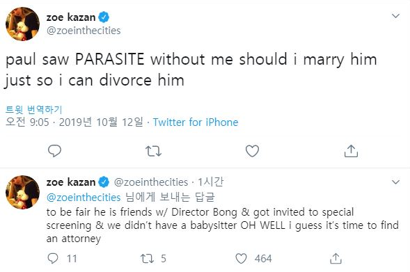 조 카잔은 2019년 10월 트위터를 통해 남자친구인 폴에 대해 이렇게 푸념했다. 봉준호 감독에게 특별 시사회를 초대받았지만, 두 사람이 베이비시터를 따로 두지 않고 있는 관계로 자신은 집에서 아이를 돌봐야 했기 때문!