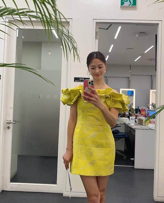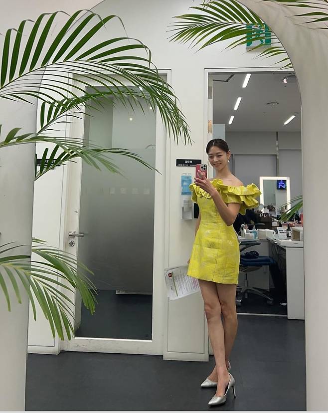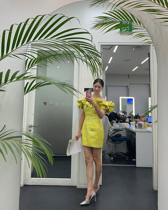 장신영은 화사한 옐로우 드레스로 눈부신 비율을 과시했습니다.