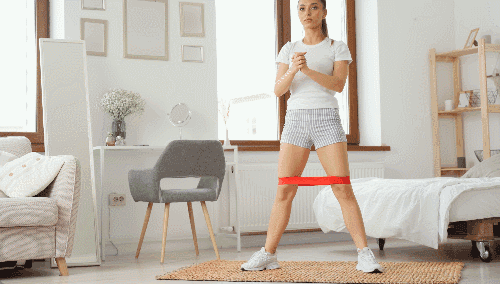 바닥에 서서 다리 사이에 밴드를 착용합니다. 다리를 넓게 벌립니다. 손은 가슴 앞에서 교차하거나 손을 맞잡아 안정감을 유지합니다. 스쿼트 동작을 반복합니다.