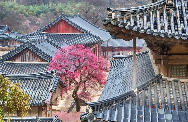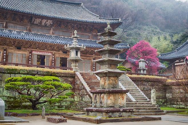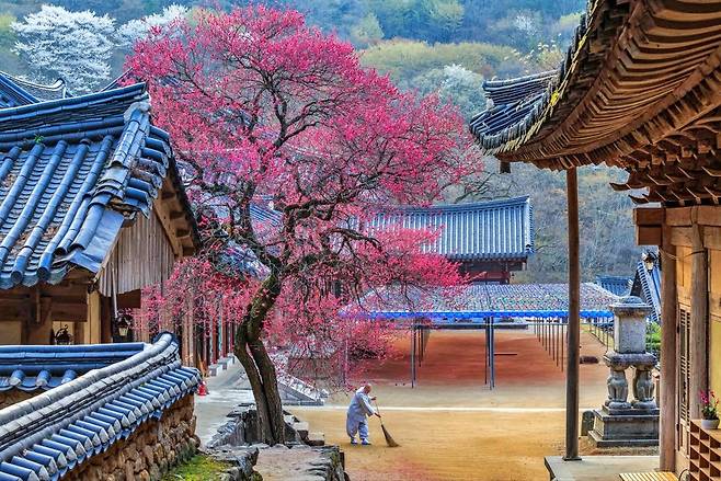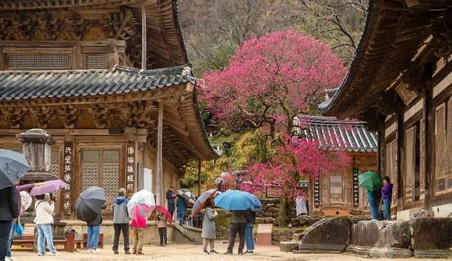 화엄사의 봄을 상징하는 존재는 천연기념물로 지정된 홍매화, 이른바 ‘화엄매’다. 최근 수년간 개화 시기는 3월 초부터 하순, 만개는 3월 하순에서 4월 초에 집중되는 편이다. 붉게 피어난 홍매화와 각황전, 그리고 뒤로 펼쳐진 지리산 능선을 함께 담으면 이곳만의 장면이 완성된다. 시기를 잘 맞추면 산벚꽃까지 더해져 한 폭의 풍경을 이룬다.