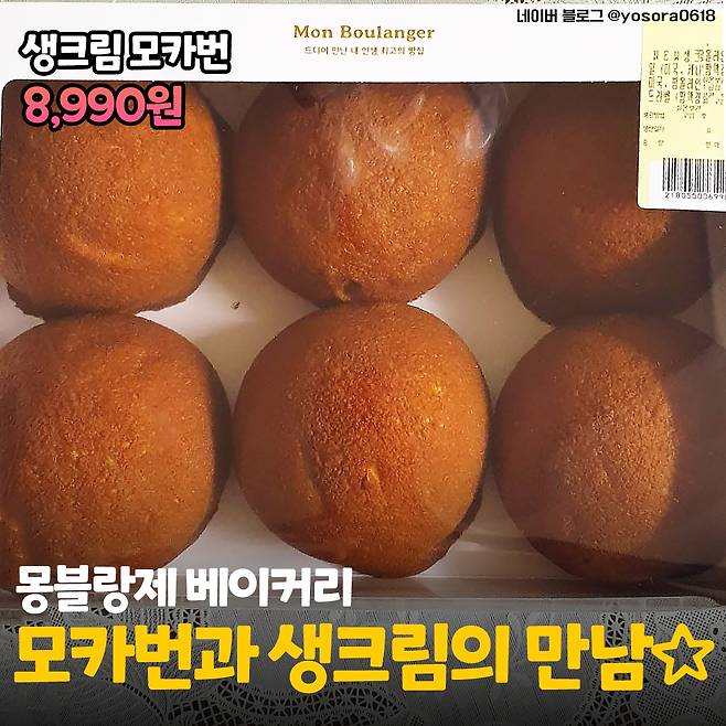 네 번째는 밥심이 두박스 쟁여오리라 벼르고 있는 <생크림 모카번>이에요+_+/ 홈플러스에 입점되어 있는 몽블랑제라는 베이커리에서 구매할 수 있고 한 박스에 6개 들어있다고 해요.