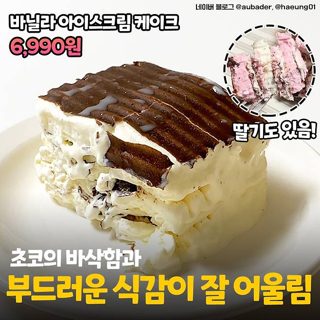 윗면에 초콜릿이 얇게 코팅되어 있고 옆면에는 아이스크림이 꼬불꼬불한 모습으로 덮여 있어요. 한입만 먹어도 당충전이 빡 될 것 같은 비주얼이지만 의외로 연~한 바닐라 아이스크림 맛이라고 해요!