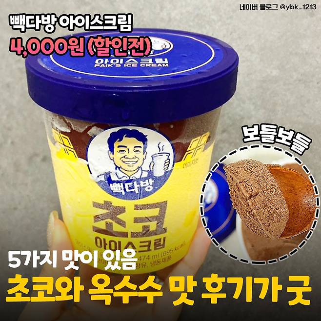 세 번째도 아이스크림이에요. 바로 백종원 선생님의 <빽다방 아이스크림>~☆ 맛도 밀크, 딸기바나나, 초코, 흑임자, 옥수수 등 다섯 가지나 된다고 해요. 구르면서 봐도 버릴 맛이 없어 보이니 다섯 가지 다 챙겨 와야겠어요ㅎㅅㅎ