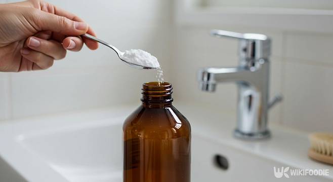 샴푸통에 베이킹소다를 한 스푼에서 두 스푼 정도 넣는다. 보통은 한 스푼이면 충분하다. 베이킹소다는 기름때와 물때를 제거하는 데 효과적이라 욕실 청소에 유용하다.