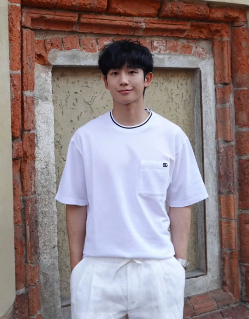 정해인이 착용한 의상은 흰색 반소매 티셔츠와 린넨 팬츠로 구성된 셋업 스타일이다.