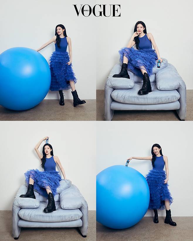 고윤정은 짙은 블루 컬러의 슬리브리스 드레스는 하늘하늘한 튤 소재가 층층이 겹쳐져 마치 발레리나의 튀튀 스커트를 연상케 했고, 여기에 매치한 투박한 워커 부츠가 하이틴 무드에 반전 매력을 더했습니다.