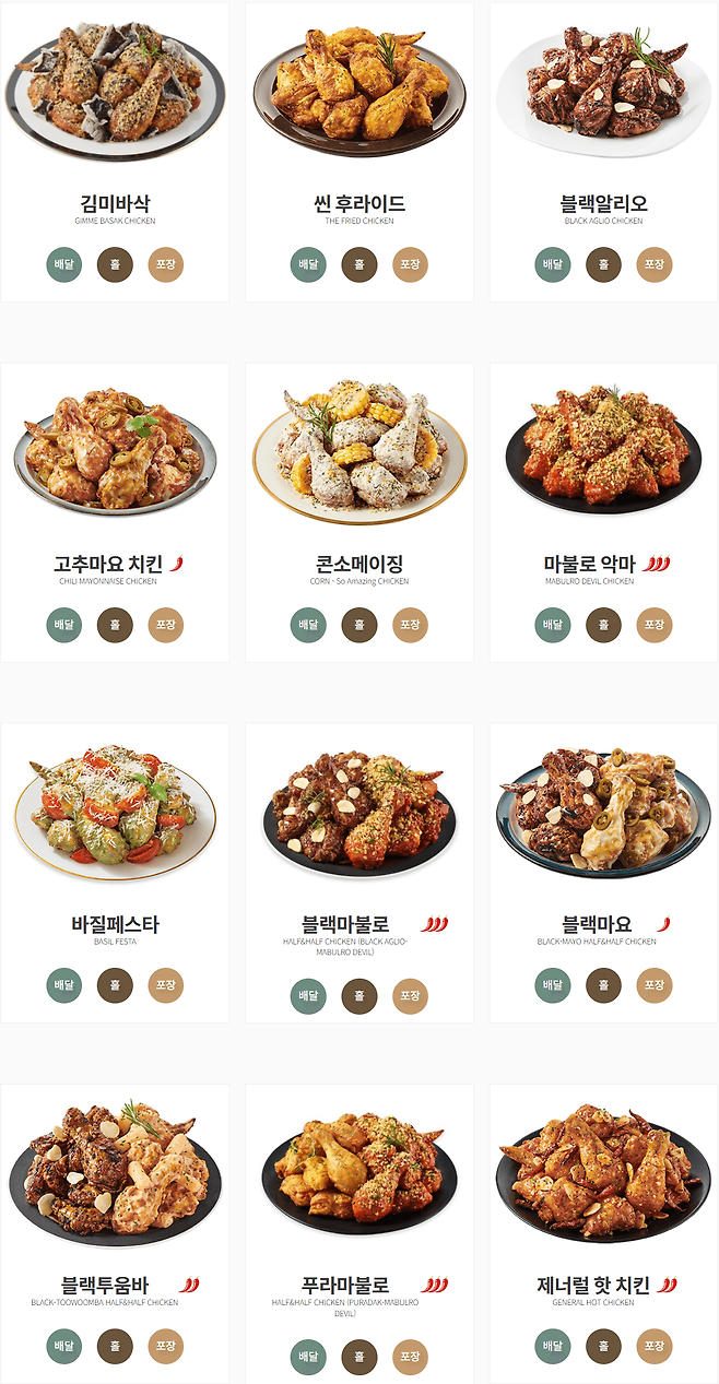 - 매드갈릭 치킨 : 마늘에 미치다. 깊은 마늘향, 알싸한 마늘의 맛과 바삭한 마늘크러쉬드의 환상적인 조합. 기존의 마늘치킨의 업그레이드 버전.