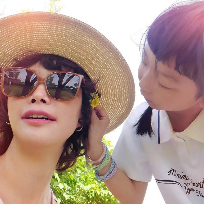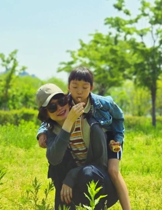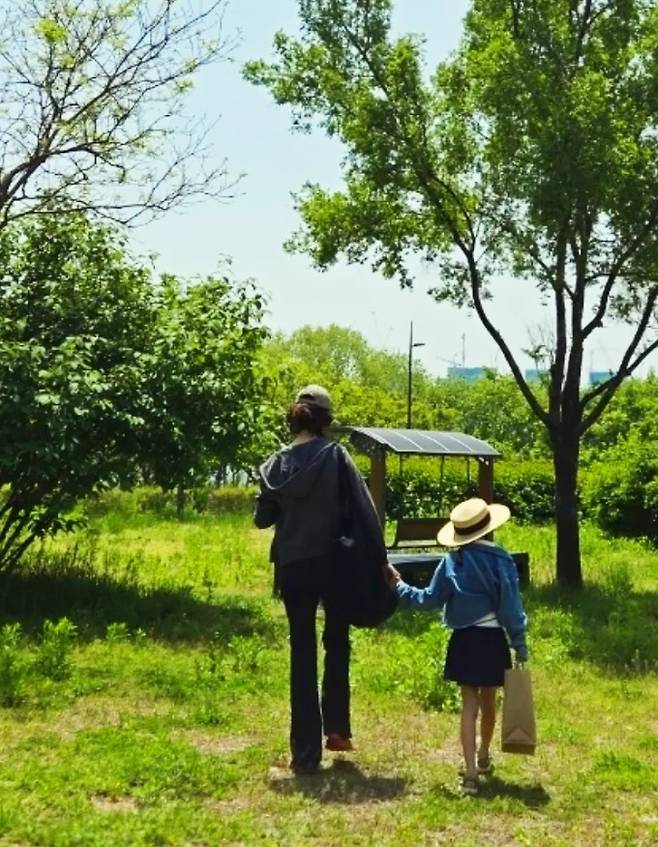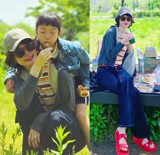 공개한 사진에서 송경아는 데님 팬츠에 스트라이프 민소매 티셔츠를 입고 집업 후드 재킷을 걸친 모습을, 딸 도해이는 미니 스커트에 데님 재킷을 걸친 모습으로 닮은꼴 스타일의 청청 피크닉룩을 완성했다.