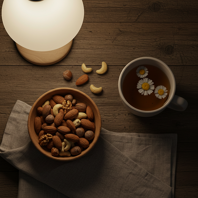 견과류는 지방과 단백질이혈당을 안정적으로 유지해주기 때문에, 밤에 먹으면 혈당 변동 없이편안하게 잠들 수 있습니다.