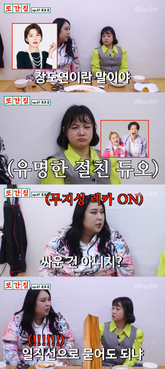이날 풍자는 ‘목포의 딸’ 박나래와 함께 목포 맛집을 함께 다녔다. 음식을 먹던 중 풍자는 박나래에 “궁금한 게 있는데 박나래하면 당연히 생각나는 게 장도연이다. 근데 요즘은 활동하는 게 많이 안 보인다. 싸운건 아니냐”라고 불화설을 언급했다.