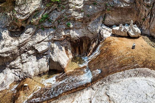 주전골의 유래는 ‘바위가 엽전 쌓아놓은 것처럼 생겼다’ ‘도적들이 위조 엽전을 만들다가 걸렸다’라는 두 가지의 설이 있다고 전해지죠. ‘오색(五色)’은 주전골 암반이 다섯 가지 빛을 내고 옛 오색석사에 봄이면 다섯 가지 색의 꽃이 피는 나무가 있었다고 하여 생긴 이름으로, 그 명성만큼이나 설악산의 한 군데에서 빛을 내고 있는 장소라 해도 손색이 없을 정도랍니다.