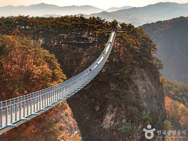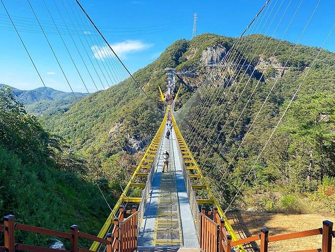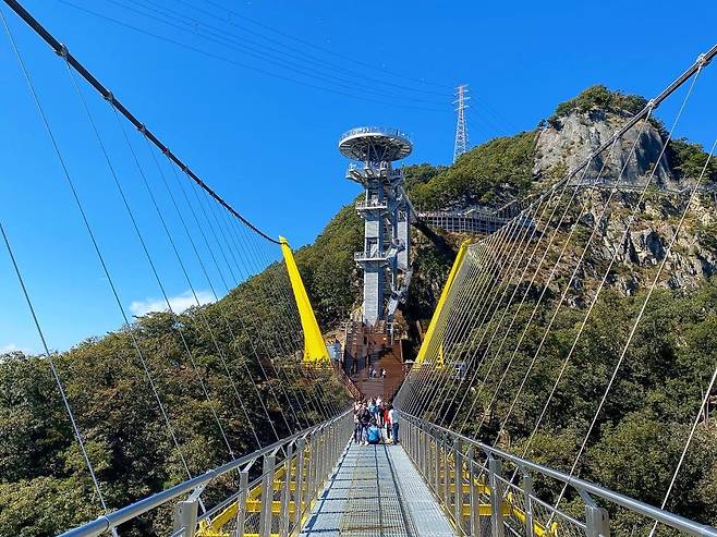 최근 가장 화제가 된 곳은 바로 소금산 울렁다리입니다.길이 404m, 국내 최장 보행 현수교로 유리 바닥 구간을 건널 때면 누구나 심장이 두근거릴 만큼 긴장감이 느껴집니다. 바람에 흔들리는 다리 위, 푸른 하늘 아래에서 맞이하는 그 순간은 두려움보다 짜릿함이, 긴장보다 해방감이 더 크게 다가옵니다. 예능 <1박 2일>에서도 아이브가 건넜던 다리로 알려지며 국내외 관광객이 찾는 명소로 자리 잡았습니다.