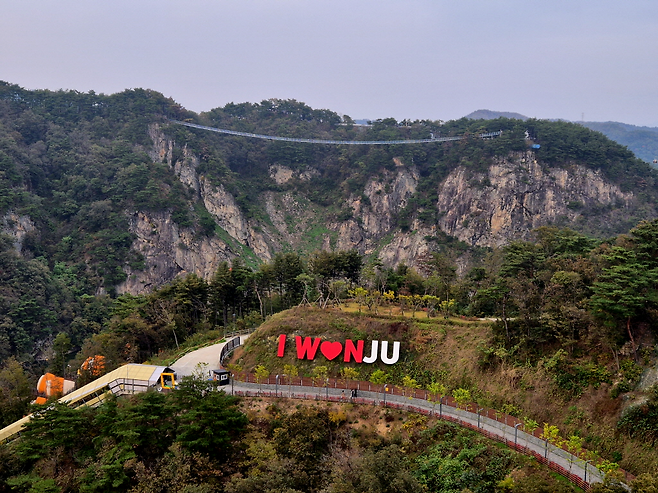 지상 200m 높이, 360m 길이의 길은 바위 절벽과 숲이 어우러져 스릴과 자연의 조화가 완벽하게 어우러집니다. 그리고 지상 150m에 세워진 스카이타워에 오르면 섬강과 원주 시내를 한눈에 내려다볼 수 있는 장관이 펼쳐집니다.