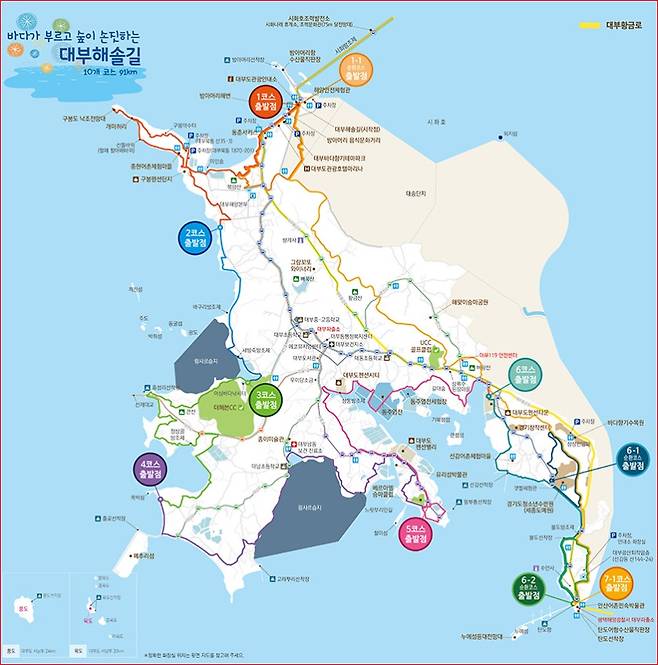 구간 : 대부도관광안내소 → 북망산 → 구봉약수터 → 개미허리 → 낙조전망대 → 종현어촌체험마을