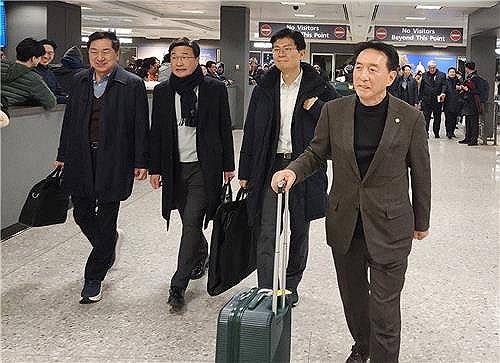 (워싱턴=연합뉴스) 박성민 특파원 = 김석기 국회 외교통일위원장(오른쪽 첫번째) 등 한국 의원들이 도널드 트럼프 미국 대통령 당선인의 오는 20일(현지시간) 취임식에 참석하기 위해 18일 워싱턴DC 인근 덜레스 국제공항을 통해 미국에 도착하고 있다. 2025.1.18