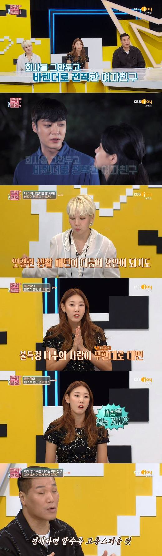 18일 오후 방송된 케이블채널 KBS Joy '연애의 참견 시즌3'에선 안정적인 직장을 그만두고 바텐더로 전향한 4세 연하의 여자친구 때문에 고민이라는 30세 남성의 사연이 그려졌다.