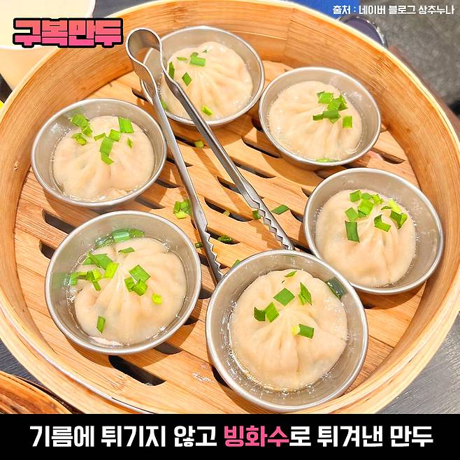 미쉐린 가이드 서울 2023에 선정된 구복만두. 구복만두는 기름으로 튀기지 않고 빙화수로 튀겨서 바닥은 굽고 윗부분은 찐만두의 식감을 자랑한다고 하는데 만두 한 개로 군만두와 찐만두를 동시에 즐길 수 있어서 좋은 것 같아요~