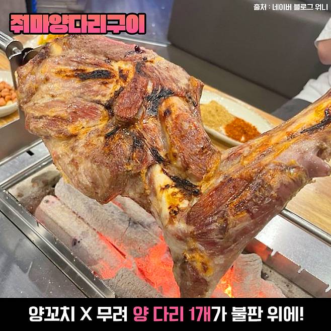 양꼬치 아니죠~ 양다리 맞습니다! 무려 양다리 한 개가 불판 위에서 돌아가는데 아마 처음 드시는 분들은 사진을 열심히 찍을 것 같은 비주얼이에요~ 불판 위에서 익으면 조금씩 칼로 잘라먹으면 되는데 뜨거우니 조심!