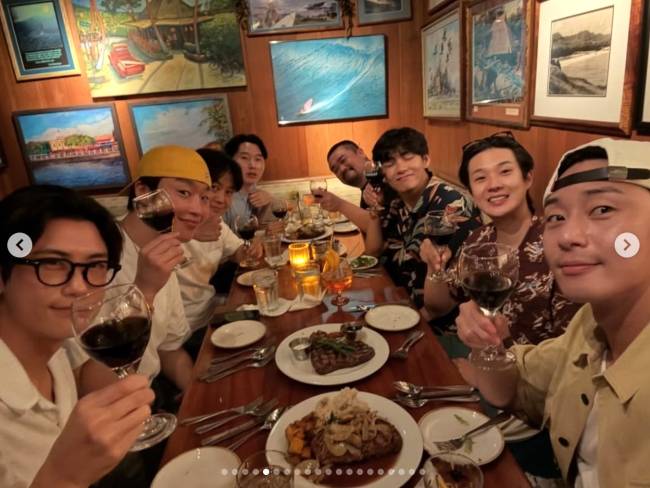 공개된 사진에는 뷔의 연예계 사모임인 우가팸 멤버들의 모습이 담겨 있었다. 배우 박서준부터 최우식, 박형식, 가수 픽보이까지 완전체 모습이 담겨 있었다.