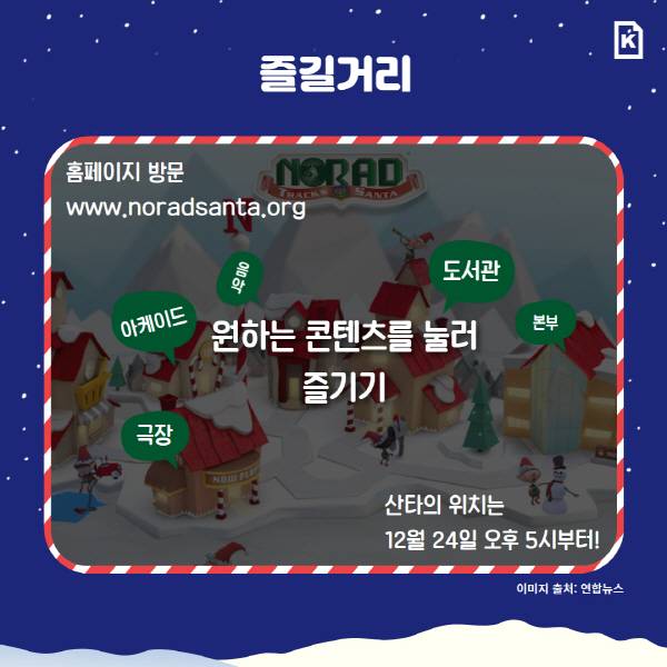 영어로 “Where is Santa?” 한마디면 산타클로스의 위치를 알 수 있다. 북미항공우주방위사령부(NORAD)가 운영하는 산타 추적기는 전화나 메일, 웹 사이트를 통해 산타의 실시간 위치를 알려준다. 또 여러 가지 게임과 함께 세계 최고 규모 눈싸움도 간접적으로 체험할 수 있다.
