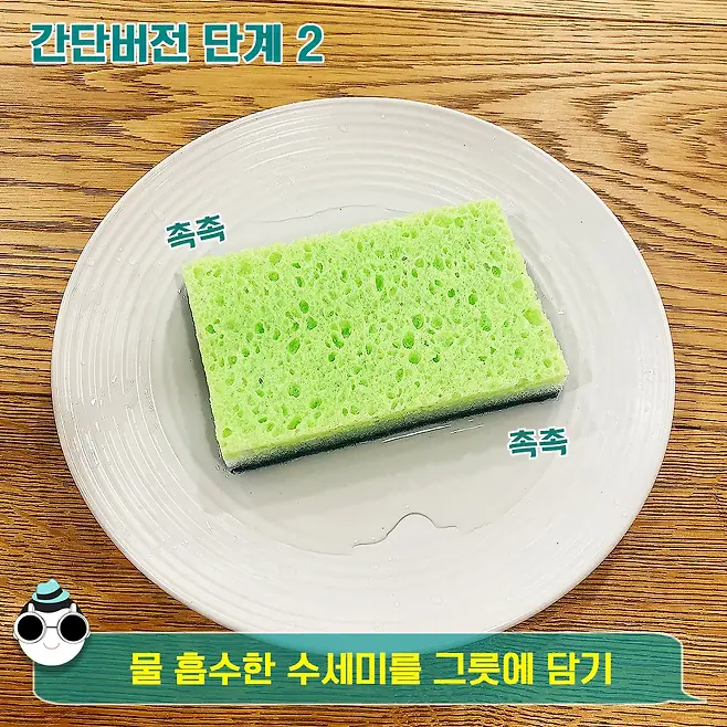 보이시나요? 이렇게 물을 가득 흡수한 수세미! 촉촉함의 끝판왕이 되어버린~ 이렇게 물에 흡수시킨 수세미를 한번 쭉 짜주세요! 너무 완벽하게 물을 제거할 필요는 없답니당. 그런 다음에, 그릇에 옮겨주기!