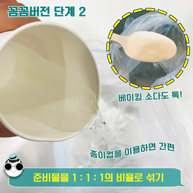 비닐 봉지에 식초, 베이킹 소다, 물을 1:1:1의 비율로 넣어주세요~ 집에 저울이 있다면 너무 편하겠지만, 는 간단하게 종이컵을 이용했어요. 여러분들도 집에 종이컵이 있다면 쉽고 간단하게 비율을 맞출 수 있으니 참고하기^*^
