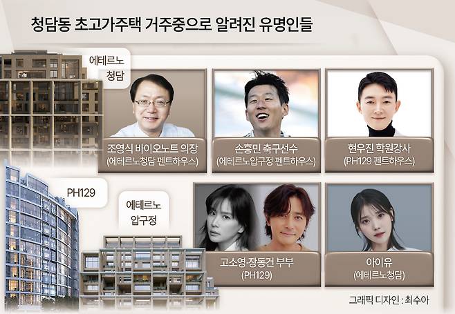 아이유가 사는 곳으로 알려진 ‘에테르노 청담’의 슈퍼 펜트하우스 소유주는 조영식 SD바이오센서 회장이다. 이 곳 또한 2021년 분양가 300억원으로 국내 최고가를 기록해 화제가 됐다. 조 의장의 회사는 코로나19 자가진단키트 제조업체로, 팬데믹 기간 동안 1조4000억원대의 순이익을 남겨 화제가 됐다. 에테르노 청담은 배틀그라운드 개발자로 알려진 김창한 크래프톤 대표, 이승건 비바리퍼블리카 대표, 한성수 플레디스엔터테인먼트 대표 등이 매입한 것으로 알려져있다.